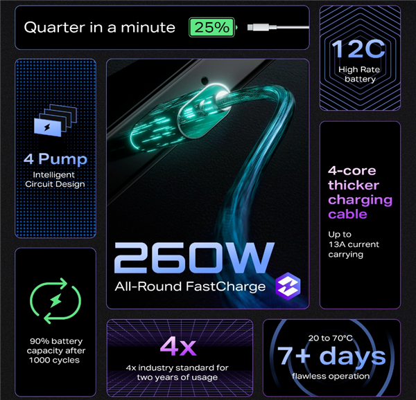 近日,国产手机厂商传音带来了260W有线快充技术,以及110W无线快充技术,均打破了目前可量产的最高纪录。据介绍,传音260W有线充满4000mAh电池只要8分钟,而且1分钟就能充到25%。其采用了定制的12C高倍率电池、能承载13A超高电流的4芯线材,能够保证功率的稳定安全输出。同时在电池寿命上也高于行业标准,1000次循环后电池容量还能保持在90%以上。可惜国内因为法规限制,无线功率上限是50W功率,在新规出台之前,我们都无法用到50W以上的无线快充。