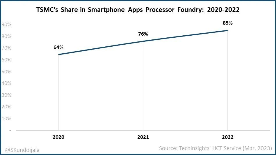 调研机构TechInsights 最新数据表明:得益于为苹果、联发科、紫光展锐代工以及在第一代骁龙8+ 和第二代骁龙8 上再次为高通代工旗舰移动 SoC,台积电在智能手机应用处理器代工份额从 2020 年的 64% 升至 2022年的 85%。而三星虽然得到了为谷歌的 Tensor 系列芯片的代工订单,但是由于 Exynos 处理器市场表现不佳,外加上高通将旗舰芯片的订单从三星转移至台积电,2022年三星的份额达到了 7 年来的最低点。