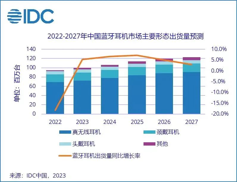 市场研究机构IDC发布的《中国无线耳机市场季度跟踪报告,2022年第四季度》显示,2022年中国蓝牙耳机市场出货量约9471万台,同比下降18.1%。其中,真无线耳机市场2022年出货量超过6881万台,同比下降15.0%。经济环境收缩、市场需求逐渐饱和以及产品功能升级瓶颈共同造成了本次下滑。但得益于户外运动的流行以及认知度的提升,骨传导耳机出货量229万台,同比增长123.6%,这也是各类型产品中唯一增长的形态。IDC预计,2023年蓝牙耳机市场预计小幅回升5%,随着渗透率不断提升,市场逐渐呈现饱和状态,在技术功能尚未出现明显革新的情况下,难以呈现大幅增长。