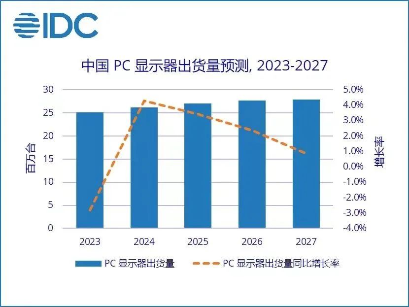 市场研究机构IDC发布的《中国PC显示器市场季度跟踪报告》显示,2022年第四季度中国PC显示器出货量为676万台,同比下降17.1%。IDC数据,2022年全年中国PC显示器出货量为2583万台,同比下降20.1%;其中消费市场同比下滑8.3%,商用市场同比下滑27.6%。终端需求疲软,全产业链承压前行。IDC预测,2023年中国PC显示器难以实现快速反弹,需求的集中释放将会延缓到2024年。IDC预计,2024年中国PC显示器出货量为2618万台,同比增长4.3%。