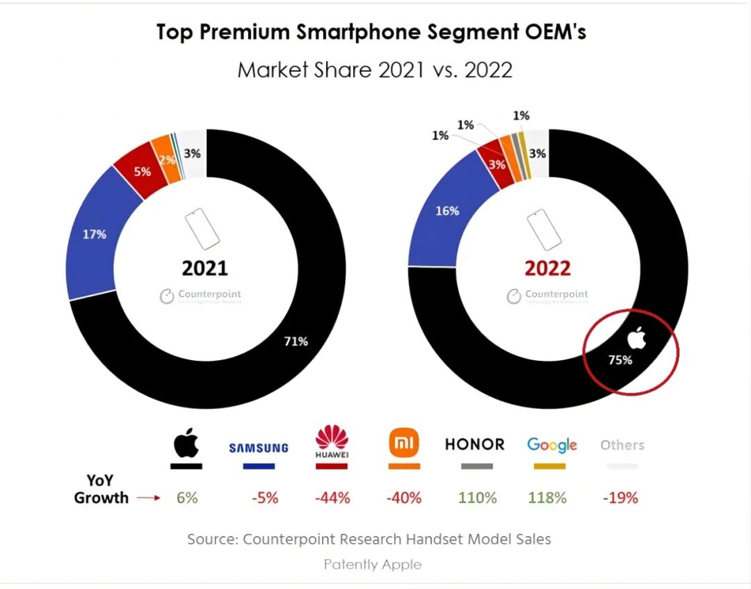 ■ 苹果2022年在全球高端智能手机市场份额不降反增,已达到75%