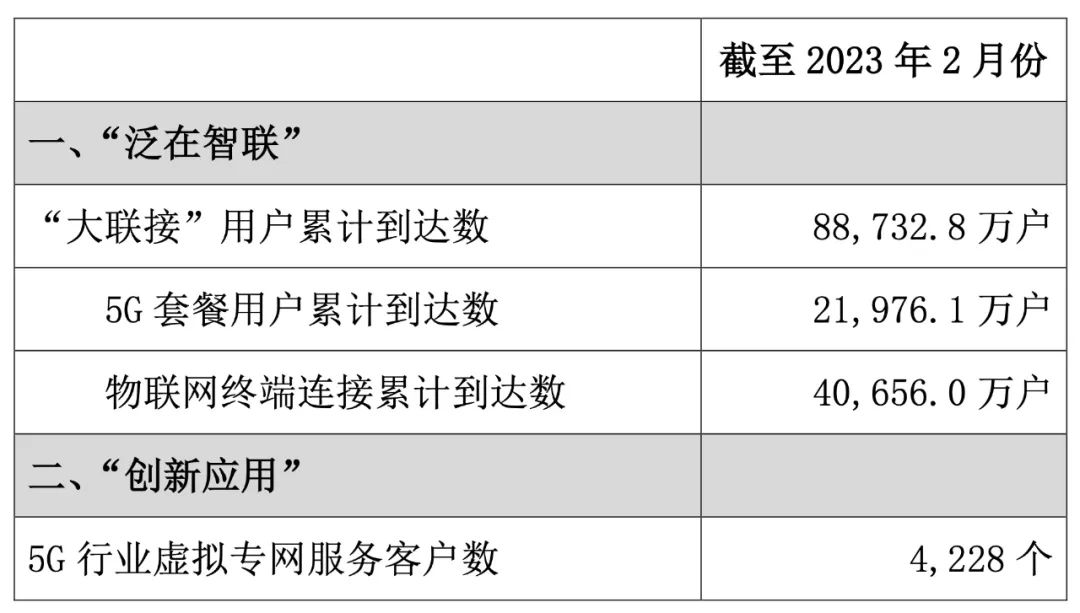 中国联通公布了截止2023年2月份的运营数据。数据显示,“大联接”用户累计达到8.87亿户,同比增加了1458万户;其中5G套餐用户累计到达数2.20亿户,同比增加了397万户;物联网终端连接累计到达数4.07亿户,同比增加了1115万户。此外,5G行业虚拟专网服务客户数4228个,同比增加了216个。
