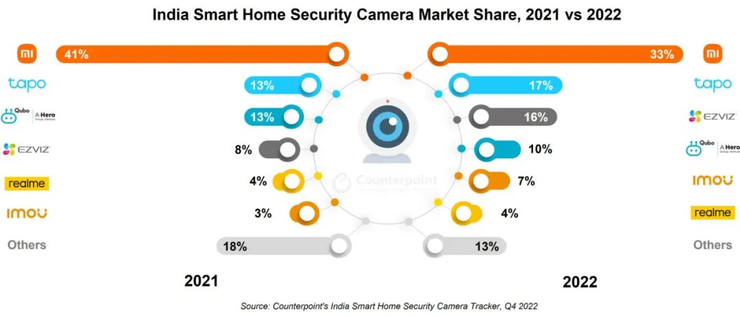 近日市调机构 Counterpoint 表示,印度智能家居安防摄像头(以下简称智能摄像头)在 2022 年需求强劲,出货量同比增长 44%。其中,小米占 2022 年印度市场智能摄像头出货量的 33%,领先其他竞争对手。但是其出货份额相较 2021 年的 41% 有所下降。但由于萤石和 TP-Link 旗下的 Tapo 等企业在 2022 年份额分别有 3% 和 4%的提升,所以目前印度智能摄像头市场仍由中国企业主导。