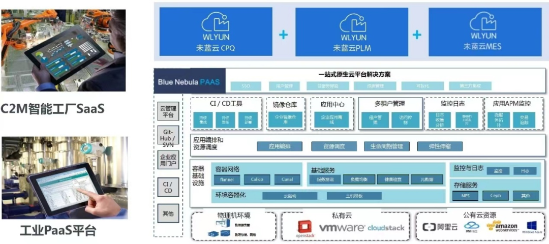 「未蓝科技」研发了C2M柔性制造工业互联网平台「未蓝云」。针对离散制造业“多品种小批量、个性化定制和柔性制造”的市场需求,平台基于云原生、数字线程和数字孪生技术,为目标客户提供C2M个性定制、柔性设计、柔性制造、柔性供应链四大业务环节一体化的工业互联网平台解决方案。此外,未蓝云基于模块化、矩阵化的产品设计理念,提供了一个统一的数字线程底座,使得个性定制(云CPQ )、柔性设计(云PLM)、柔性制造(云MES)和柔性供应链(工业PaaS中台)四大业务环节的SaaS功能组件可以单独使用,也可以自由组合搭建形成更为复杂和完整的C2M柔性制造工业互联网解决方案,实现了C2M大规模定制生产全链条环节的数字化,解决了面向订单制造型企业现有软件系统功能不匹配,销售、研发和制造数据转换不顺畅,以及数据标准不统一导致的研发协同和制造协同的数据孤岛、效率低下等问题。