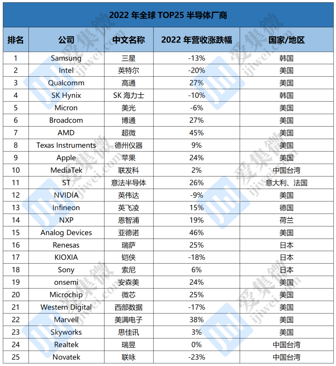 近日,市场研究机构Gartner发布了2022年度全球以及中国大陆前25名半导体厂商的营收排名。从全球来看,三星、英特尔、高通、SK海力士和美光占据了Top5,中国台湾3家厂商上榜,分别是联发科、瑞昱和联咏,无中国大陆厂商上榜。排名最高的联发科位居全球第10位。数据显示,2022年全球半导体收入达到5991亿美元,仅同比微幅增长0.2%,排名前25半导体厂商总收入同比增长1.9%,“others”总收入则同比下降5.1%。