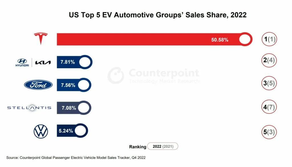 市调机构Counterpoint 发布最新数据,2022 年美国电动乘用车销量同比增长 54.5%,特斯拉占据了 50.58% 的市场份额。2022 年,电池电动汽车(BEV)销量同比增长近 70%,占所有电动汽车销量的 80% 以上。特斯拉在美国电动汽车市场以超过一半的份额遥遥领先,销量超过其他 17 个汽车集团的总和。