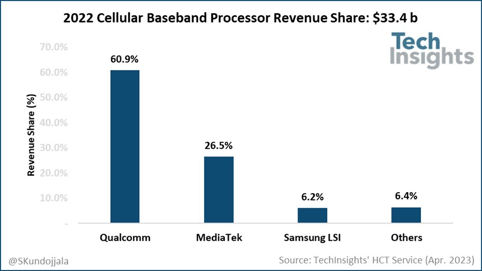 ■ TechInsights:2022年基带芯片市场增长放缓 高通份额高达61%