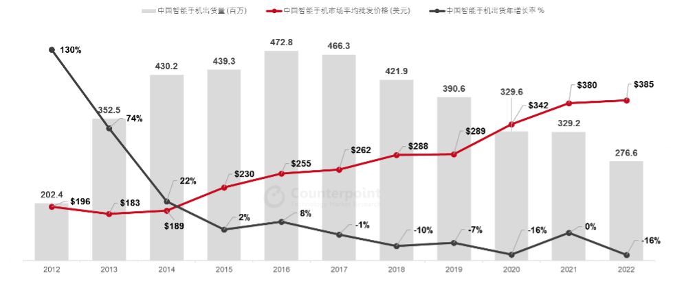 Counterpoint发布数据显示,中国智能手机市场再次探底,全年出货量同比下滑16%,降至2.8亿部以下,为近十年最低。即便如此,中国市场仍然占到了全球智能手机总出货量的22.6%,远高于第二位印度的12.4%。Counterpoint表示,始终看好中国高端智能手机市场的发展,2023年,市场整体出货量将重回2.8亿部以上,预计高端部分的表现会好于市场平均水平:同比增长接近5%。到2035年,无论是ASP还是高端智能手机的销量占比将再上一个台阶,其中500美金以上的占比有望达到四成。
